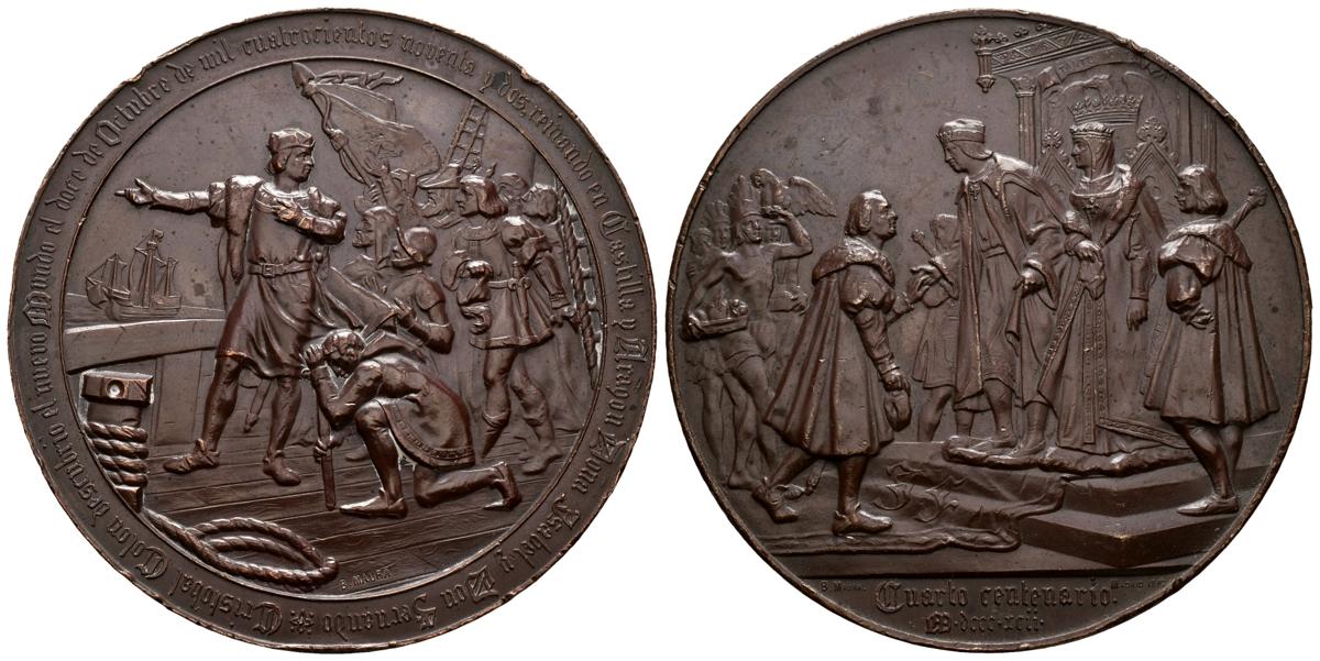 ALFONSO XIII (1885-1931). IV Centenary of the Discovery of America. (Ae. 182.46g / 69mm). 1892. Engraver: B. Maura. (You Vives 556). Very Fine. Beats on the edge.