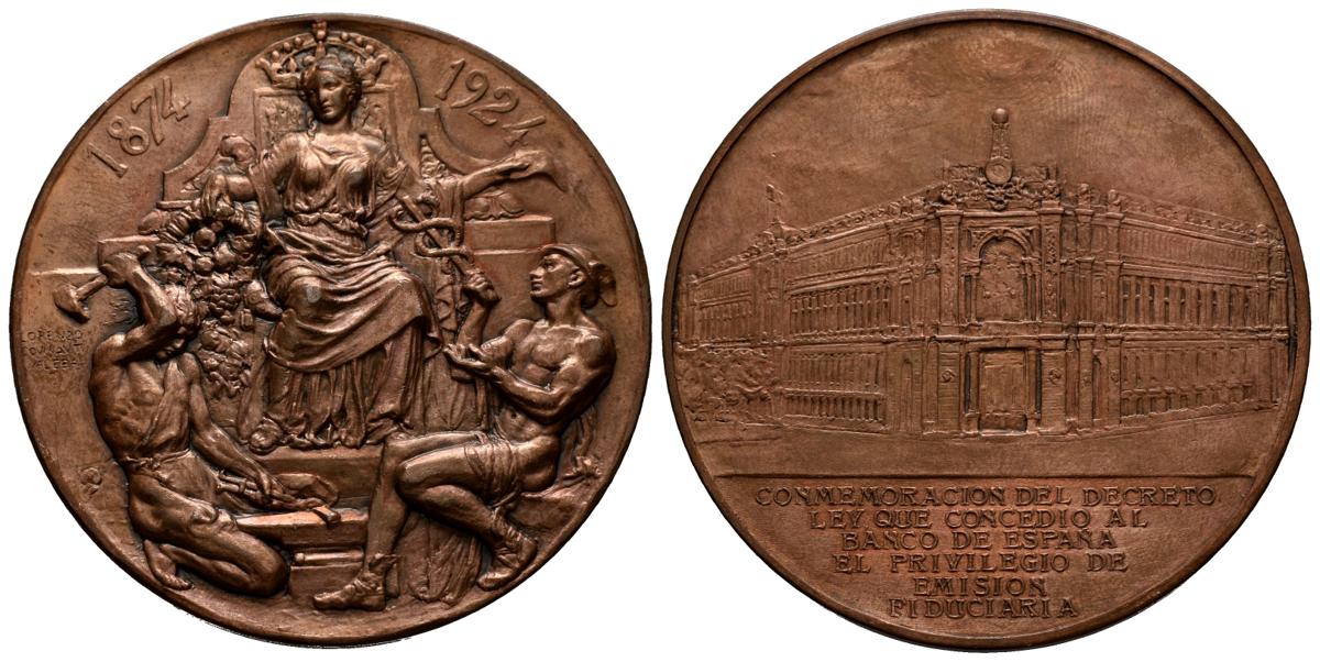 ALFONSO XIII (1885-1931). 50th Anniversary of the Concession to the Bank of Spain of the issuance of fiat currency. 1874-1924. (Ae. 92.97g / 60mm). 1924. Engraver: Lorenzo Coullaut Valera. (RAH 781). Extremely Fine.