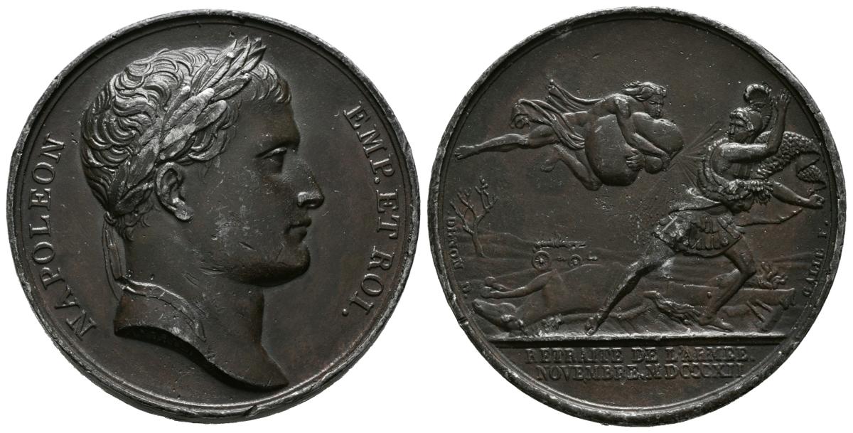 NAPOLEON BONAPARTE, Empire (1804-1815). Withdrawal of the French army from Russia. (Ae. 44.99g / 40mm). 1812. Engraver: Andrieu and Galle. (Bramsen 1168). Good Very Fine. Scratch. It is hard to believe that until just a year earlier, 1811, Russia and France were allies. The cooling of relations between both nations gave way, after knowing the wishes of Tsar Alexander I to conquer Constantinople and the need to achieve an approach to Great Britain, to the direct confrontation between both superpowers that ended with a disastrous French defeat on Russian soil. On December 14, 1812, the withdrawal of the only twenty-two thousand survivors of that “Grande Armée” was culminated, leaving almost half a million soldiers between deceased and prisoners along the way.