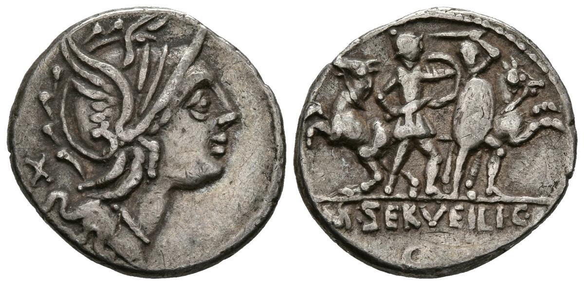 GENS SERVILIA. Denarius. (Ar. 3.92g / 20mm). 100 BC Northern Italy. (FFC 1117; Crawford 327/1). Anv: Head of Rome to the right, behind letter. Rev: Two warriors fighting on foot with horses on either side, in exergue: M SERVEILI CF, below letter. Very Fine.