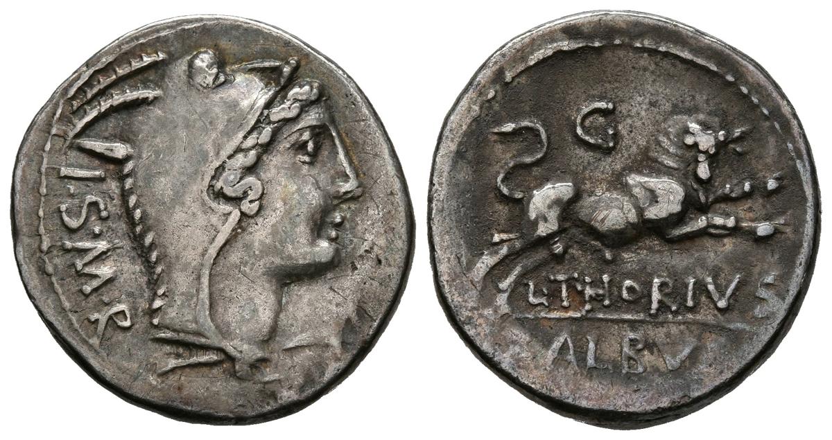 GENS THORIA. Denarius. (Ar. 3.92g / 20mm). 105 BC Northern Italy. (FFC 1141; Crawford 3161). Anv: Head of Juno Sospita on the right covered with goatskin, behind ISMR. Rev: Bull on the right, above letter: G, below legend: THORIVS, in exergue: BALBVS. Good Very Fine.