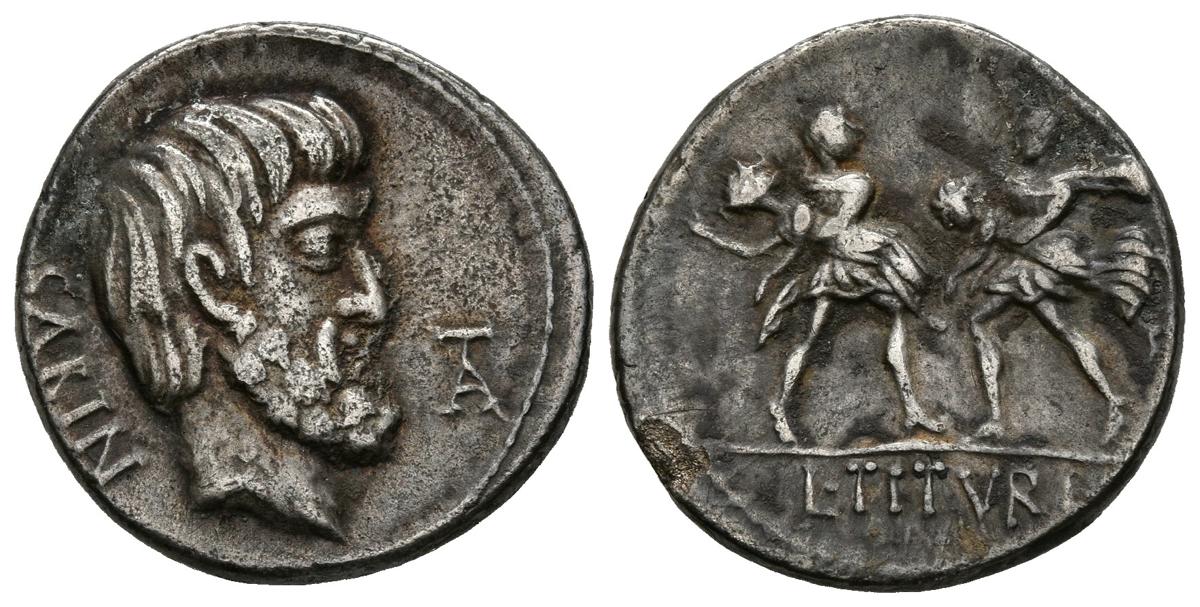 English GENS TITURIA. Denarius. (Ar. 3.80g / 19mm). 89 BC Rome. (FFC 1153; Crawford 344 / 1a). Anv: Head of King Tatius on the right, front monogram: TA, back legend: SABINA. Rev: Two Roman warriors with two junipers in their arms, in exergue: L TITVRI. Good Very Fine.