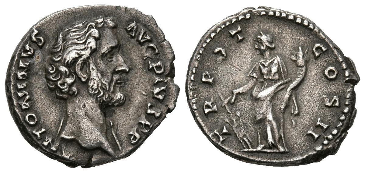 ANTONINO PIO. Denarius. (Ar. 3.22g / 18mm). 139 AD Rome. (RIC 49a). Anv: Bust of Antonino Pio on the right, around legend: ANTONINVS AVG PIVS P P. Rev: Fortuna standing on the left carrying a rudder and cornucopia, around legend: RE POT COS II. Good Very Fine.