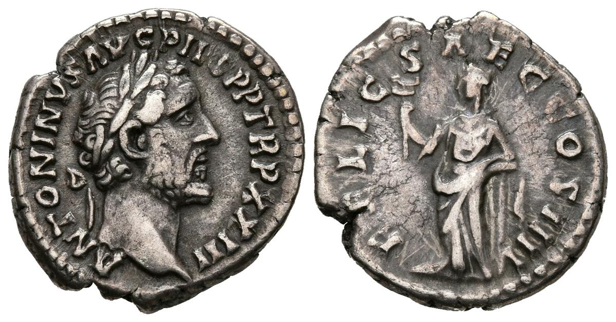 English ANTONINO PIO. Denarius. (Ar. 3.22g / 17mm). AD 159-160 Rome. (RIC 298). Anv: Laureate bust of Antonino Pío on the right, around legend: ANTONINVS AVG PIVS PP TR P XXIII. Rev: Felicitas left standing carrying caduceus, around legend: FELIC SAEC COS IIII. Very Fine.