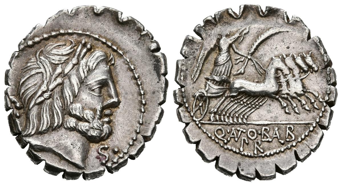GENS ANTONIA. Denarius. (Ar. 3.73g / 20mm). 83-82 BC Auxiliary Workshop of Rome. (FFC 158; Crawford 364 / 1c). Anv: Laureate head of Jupiter on the right, behind Uncirculated, in front of the letter S. Rev: Victory in a quadriga on the right with palm and laurel wreath, in exergue: Q ANTO BALB PR. Good Very Fine. Displaced coinage.