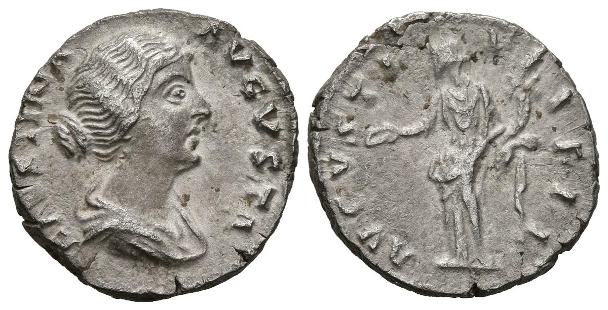 English FAUSTINA II. Denarius. (Ar. 2.59g / 16mm). 156-161 AD Rome. (RIC 496). Anv: Bust draped to the right, around legend: FAVSTINA AVGVSTA. Rev: Concordia standing on the left carrying patera and cornucopia, around legend: AVGVSTI PII FIL. Good Very Fine.