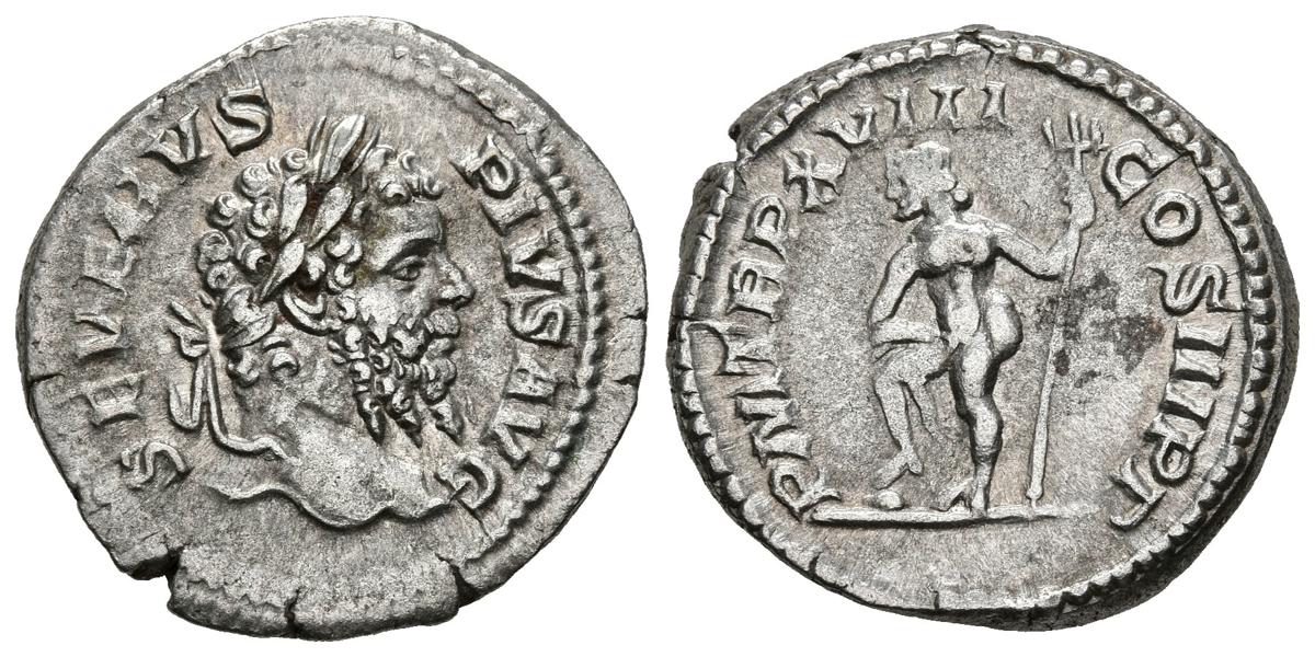 SEPTIMIUS SEVERUS. Denarius. (Ar. 3.44g / 19mm). 210 AD Rome. (RIC 234). Obv: Laureate bust of Septimius Severus on the right, around legend: SEVERVS PIVS AVG. Rev: Neptune standing left with foot on globe holding trident, around legend: PM TR P XVIII COS III P P. Good Very Fine/ Very Fine.