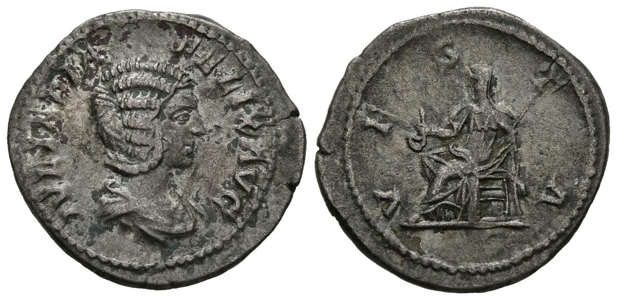 English JULIA DOMNA. Denarius. (Ar. 2.54g / 20mm). 211-215 AD Rome. (RIC 391). Anv: Draped bust of Julia Domna on the right, around legend: IVLIA PIA FELIX AVG. Rev: Vesta seated left carrying symbol and scepter, around legend: VESTA. Very Fine.