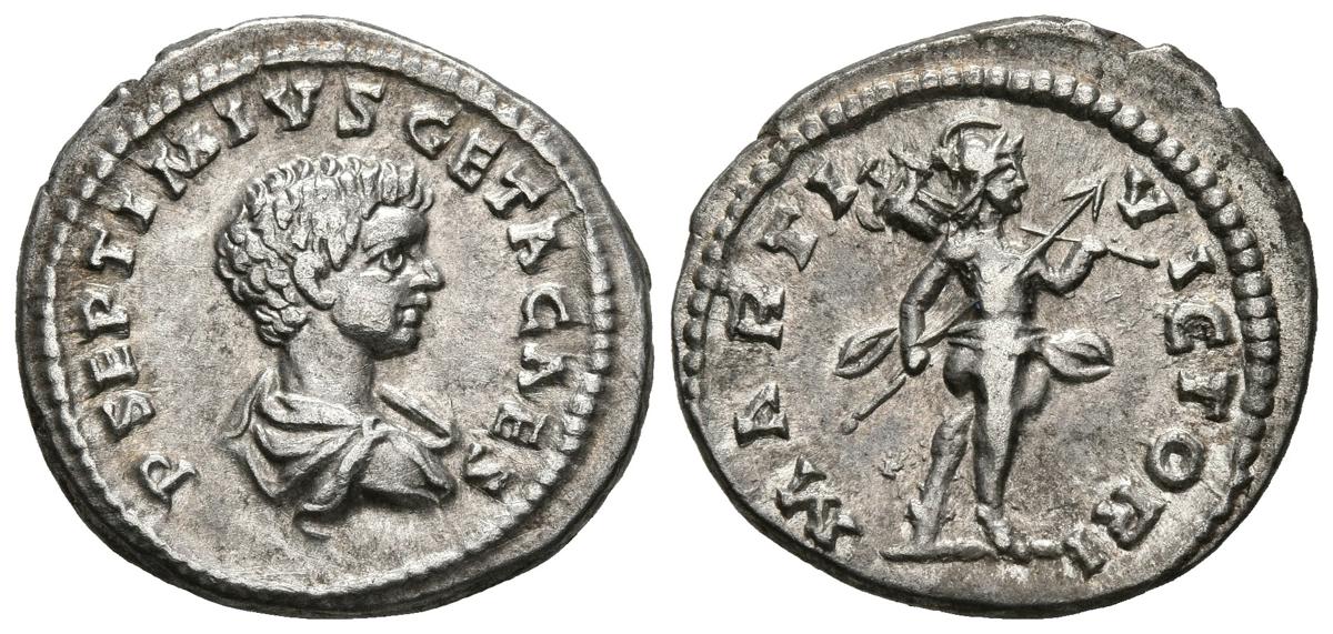 GETA. Denarius. (Ar. 3.54g / 20mm). 204 AD Laodicea. (RIC 103). Anv: Draped bust of Geta on the right, around legend: P SEPTIMMIVS GERA CAES. Rev: Mars advancing to the right carrying spear and trophy, around legend: MARTI VICTORI. Good Very Fine.