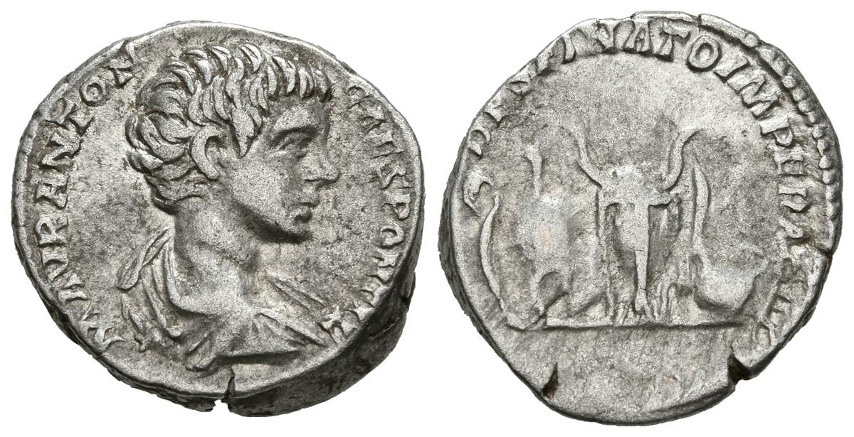 CARACALLA. Denarius. (Ar. 3.55g / 17mm). 197-198 AD Rome. (RIC 6). Anv: Draped bust of Caracalla on the right, around legend: M AVR ANTON PONTIF. Rev: Litho, apex, bucranium and simulus, around legend: DESTINATO IMPERAT. Very Fine.
