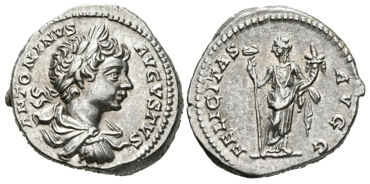 CARACALLA. Denarius. (Ar. 3.62g / 19mm). 199-200 AD Rome. (RIC 35). Anv: Laureate bust, draped and with Caracalla's cuirass on the right, around the legend: ANTONINVS AVGVSTVS. Rev: Felicitas standing on left carrying caduceus and cornucopia, around legend: CONGRATULATIONS AVGG. Extremely Fine. Precious and rare specimen.