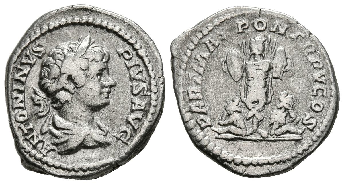 English CARACALLA. Denarius. (Ar. 3.36g / 20mm). 201 AD Rome. (RIC 65). Anv: Laureate and draped bust of Caracalla on the right, around legend: ANTONINVS PIVS AVG. Rev: Trophy between two captives, around legend: PART MAX PONT TR PV COS. Very Fine.