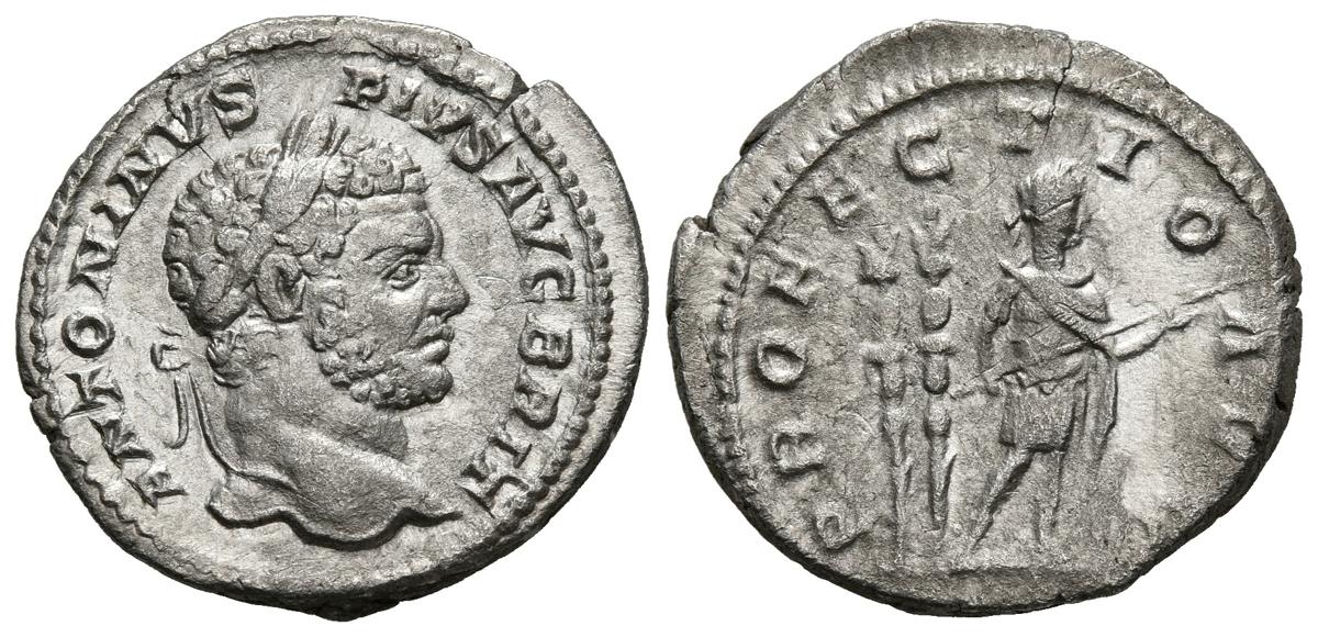 English CARACALLA. Denarius. (Ar. 2.93g / 19mm). 213 AD Rome. (RIC 225). Anv: Laureate bust of Caracalla on the right, around legend: ANTONINVS PIVS AVG BRIT. Rev: Caracalla standing on the right carrying spear, behind two banners, around the legend: PROFECTIO AVG. Very Fine.