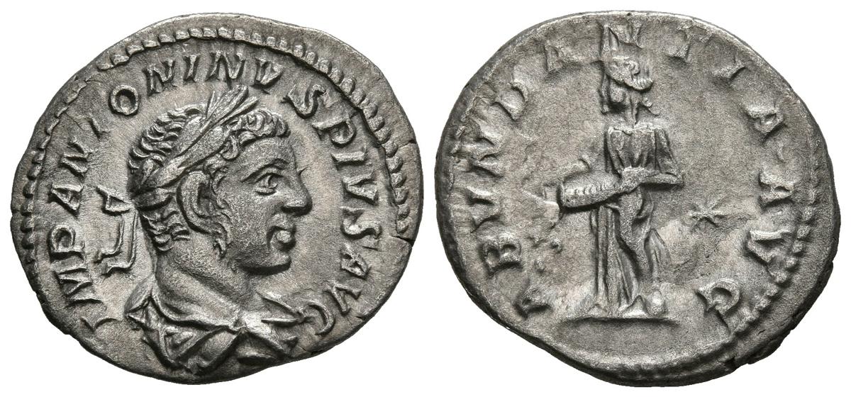 ELAGABALUS. Denarius. (Ar. 2.63g / 19mm). AD 218-222 Rome. (RIC 56). Anv: Laureate and draped bust of Heliogabalus on the right, around the legend: IMP ANTONINVS PIVS AVG. Rev: Abundantia standing to left emptying cornucopia, behind star, around legend: ABVNDANTIA AVG. Good Very Fine.