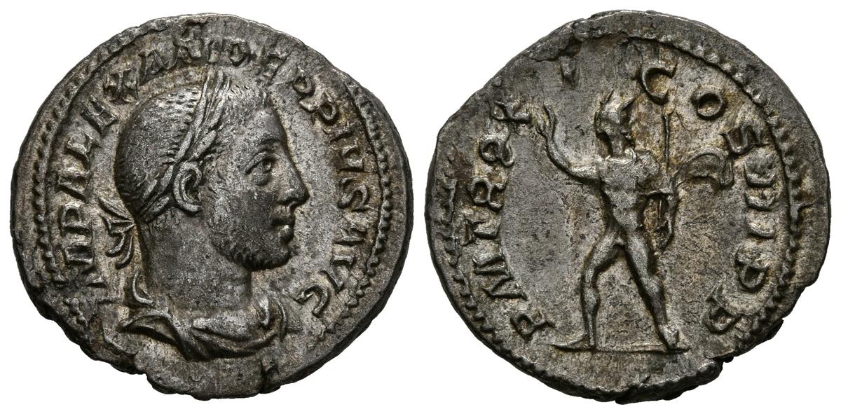 English SEVERUS ALEXANDER. Denarius. (Ar. 3.56g / 20mm). 232 AD Rome. (RIC 114). Anv: Laureate and draped bust of Alejandro Severo on the right, around the legend: IMP ALEXANDER PIVS AVG. Rev: Sun radiated advancing to the left raising hand and carrying a whip, around the legend: PM TR P XI COS III P P. Good Very Fine.