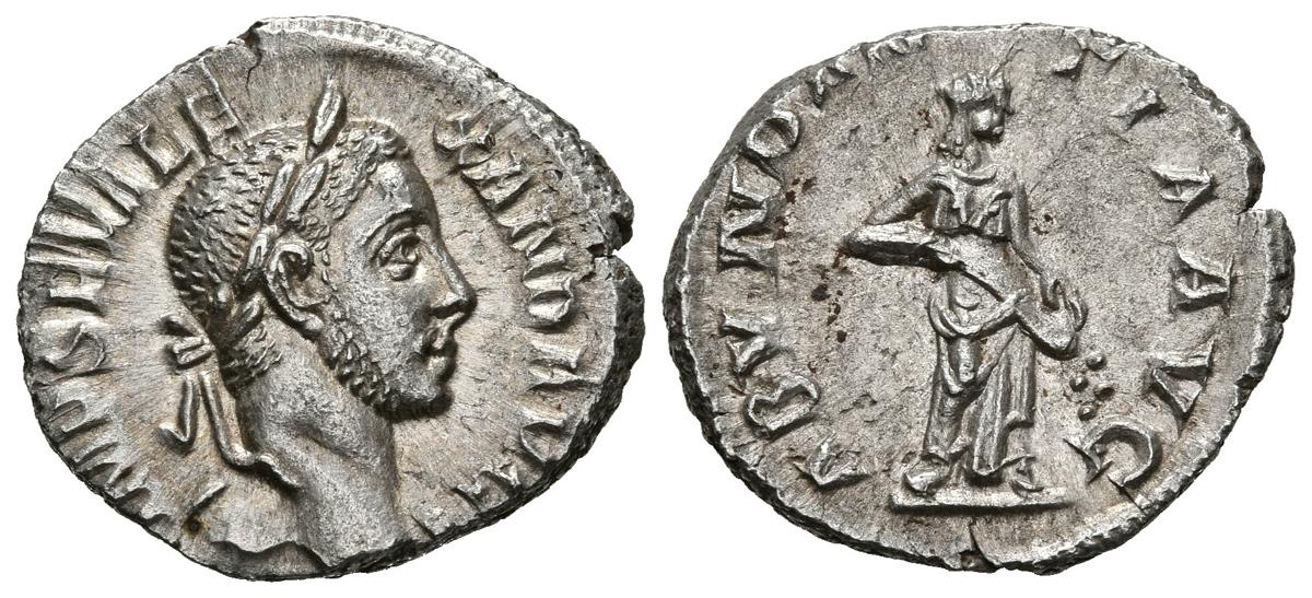 SEVERUS ALEXANDER. Denarius. (Ar. 2.37g / 18mm). 229 AD Rome. (RIC 184). Ob: Laureate bust of Alejandro Severo on the right, around the legend: IMP SEV ALEXANDER AVG. Rev: Abundantia standing to right emptying cornucopia, around legend: ABVNDANTIA AVG. Almost Extremely Fine.