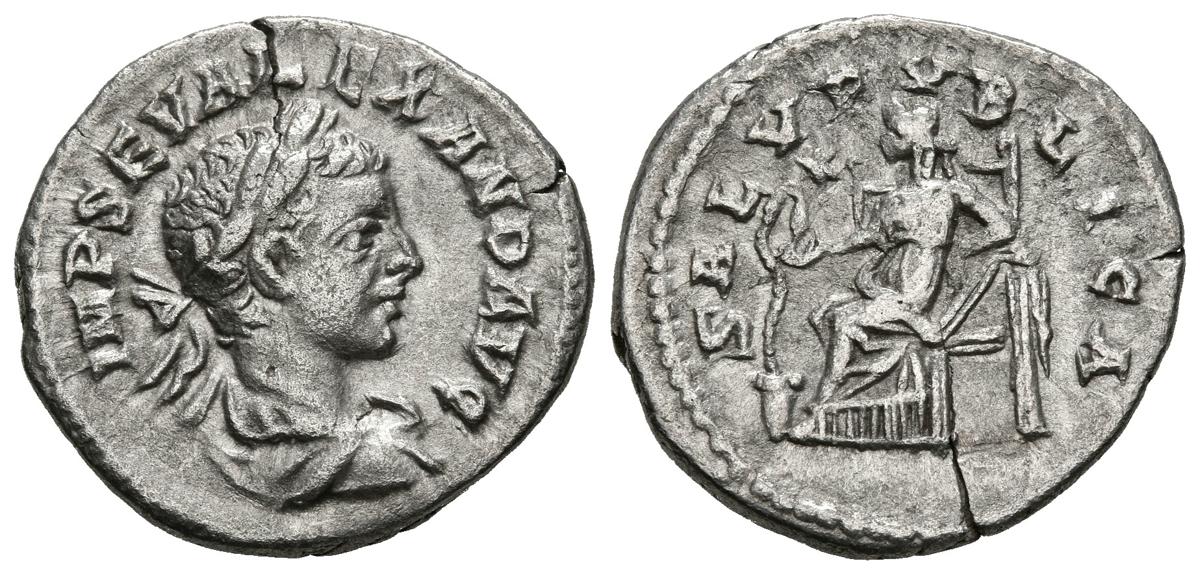 SEVERUS ALEXANDER. Denarius. (Ar. 3.02g / 20mm). 222 AD Antioch. (RIC 298). Anv: Laureate and draped bust of Alejandro Severo on the right, around the legend: IMP SEV ALEXAND AVG. Rev: Salus sitting on the left feeding a patera snake, around legend: SALVS PVBLICA. Very Fine. Scarce