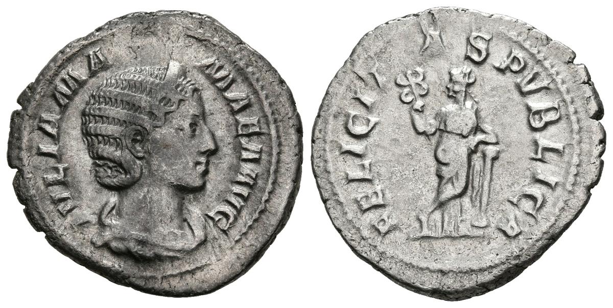 JULIA MAMAEA. Denarius. (Ar. 2.94g / 21mm). 228 AD Rome. (RIC 335). Anv: Diademic and draped bust of Julia Mamaea on the right, around legend: IVLIA MAMAEA AVG. Rev: Felicitas left standing leaning on column holding caduceus, around legend: FELICITAS PVBLICA. Very Fine.