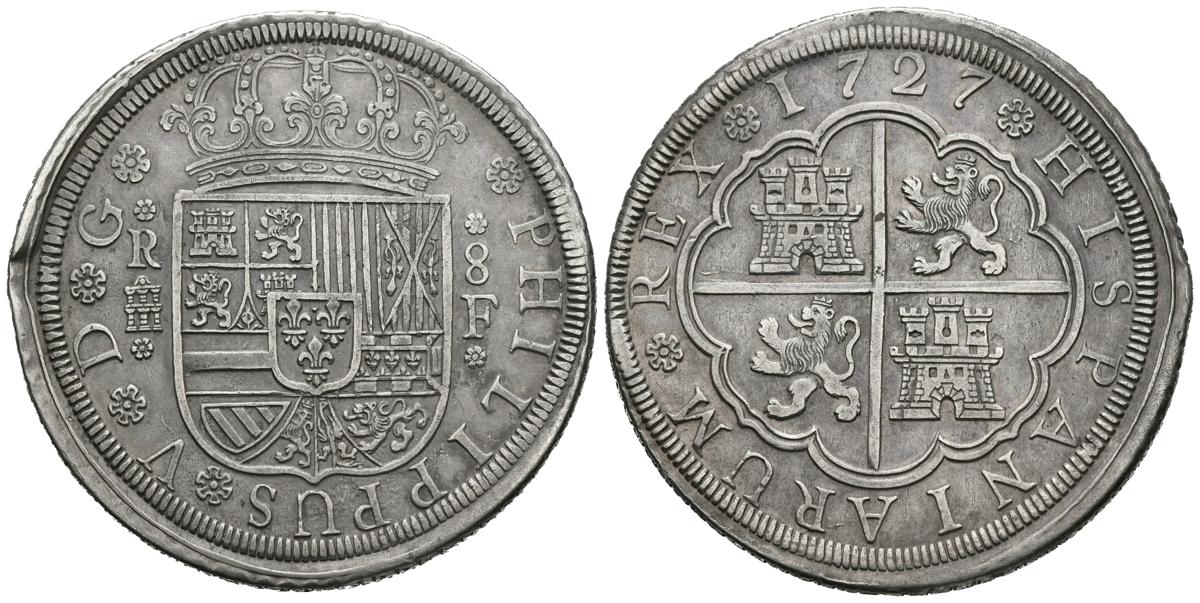 FELIPE V (1700-1746). 8 Reales. (Ar. 27.11g / 42mm). 1727. Segovia. F. (Cal-2019-1596). Almost Extremely Fine. Rare Coined in large flan, this piece was only minted for three years in the Segovian mint: 1727, 1728 and 1729. The assayer mark F corresponds to Fernando Vázquez (or Vargas).