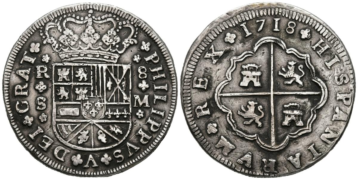 FELIPE V (1700-1746). 8 Reales. (Ar. 22.92g / 39mm). 1718. Sevilla. M. (Cal-2019-1617). Very Fine.