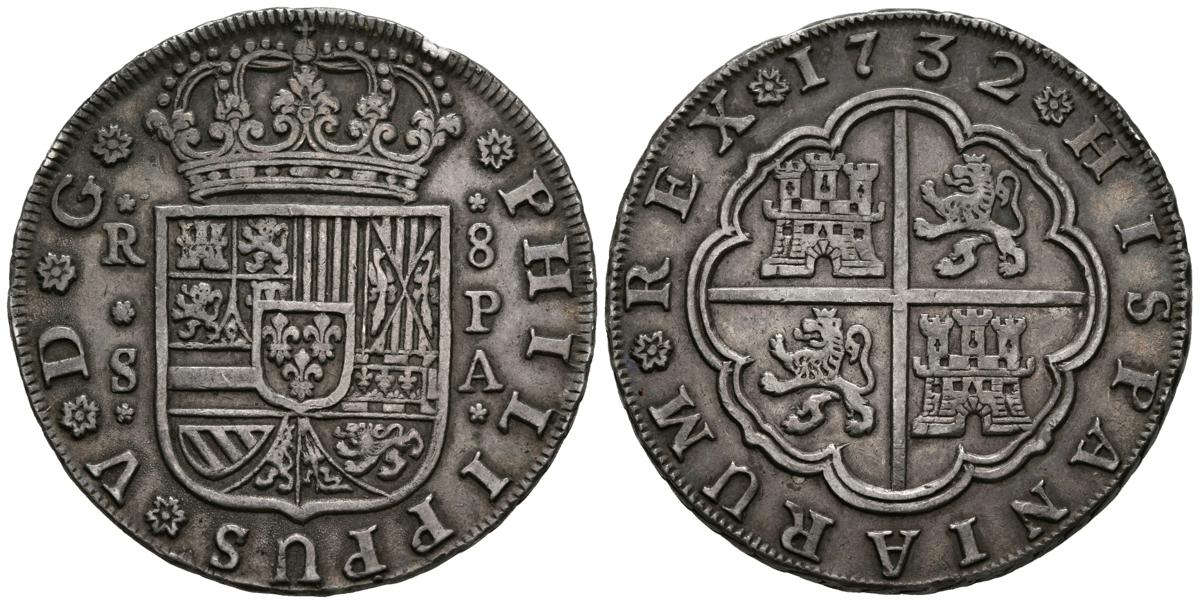 FELIPE V (1700-1746). 8 Reales. (Ar. 26.91g / 39mm). 1732. Sevilla. PA. (Cal-2019-1625). Good Very Fine. Beat on the edge.