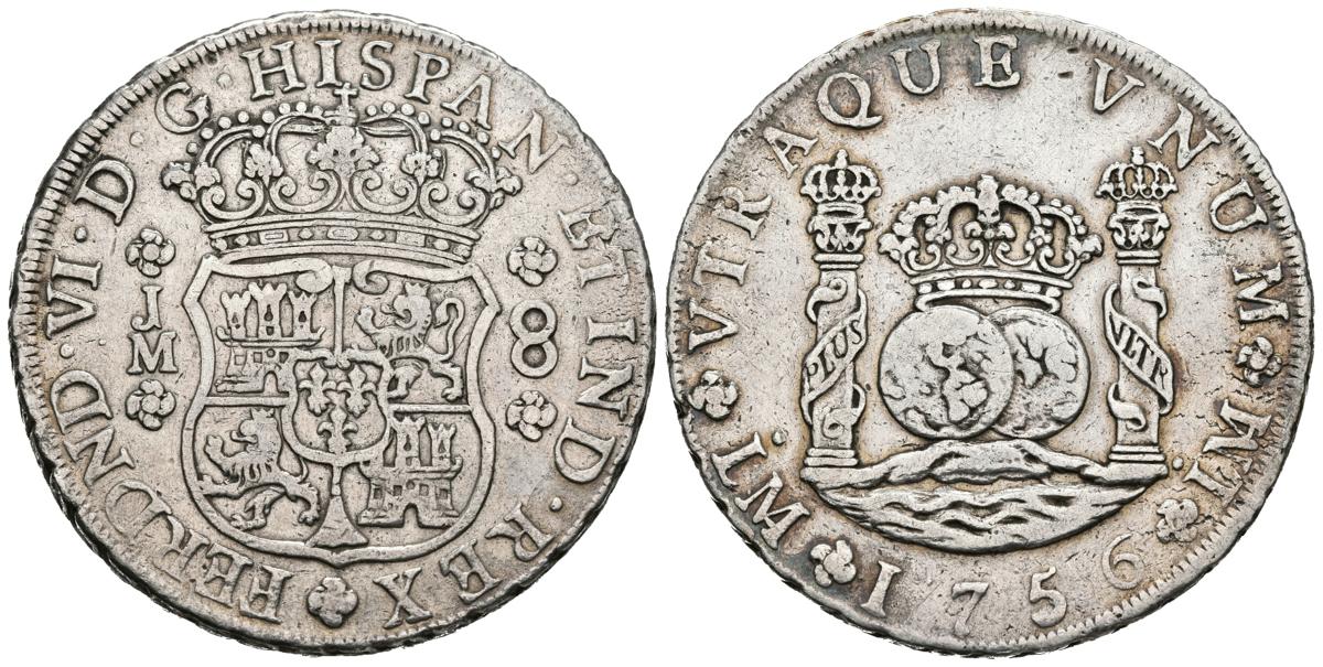 FERNANDO VI (1746-1759). 8 Reales. (Ar. 26.79g / 38mm). 1756. Lima. JM. (Cal-2019-461). Very Fine. Cleaned.