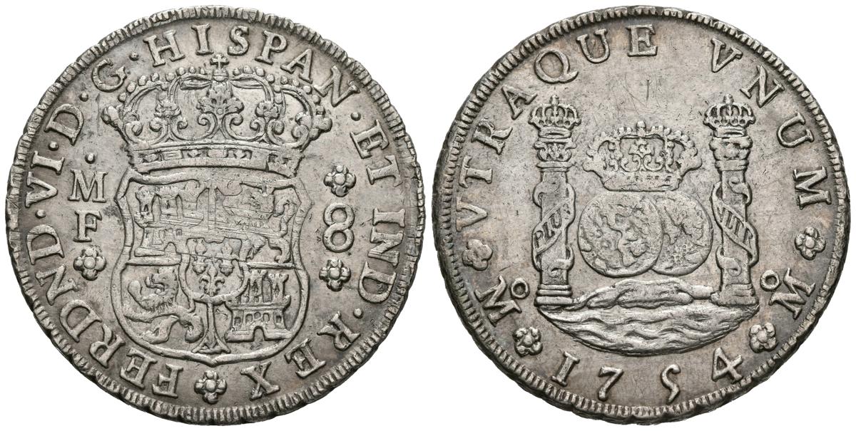 English FERNANDO VI (1746-1759). 8 Reales. (Ar. 26.91g / 39mm). 1754. Mexico. MF. (Cal-2019-482). Good Very Fine. Stripes on the obverse.