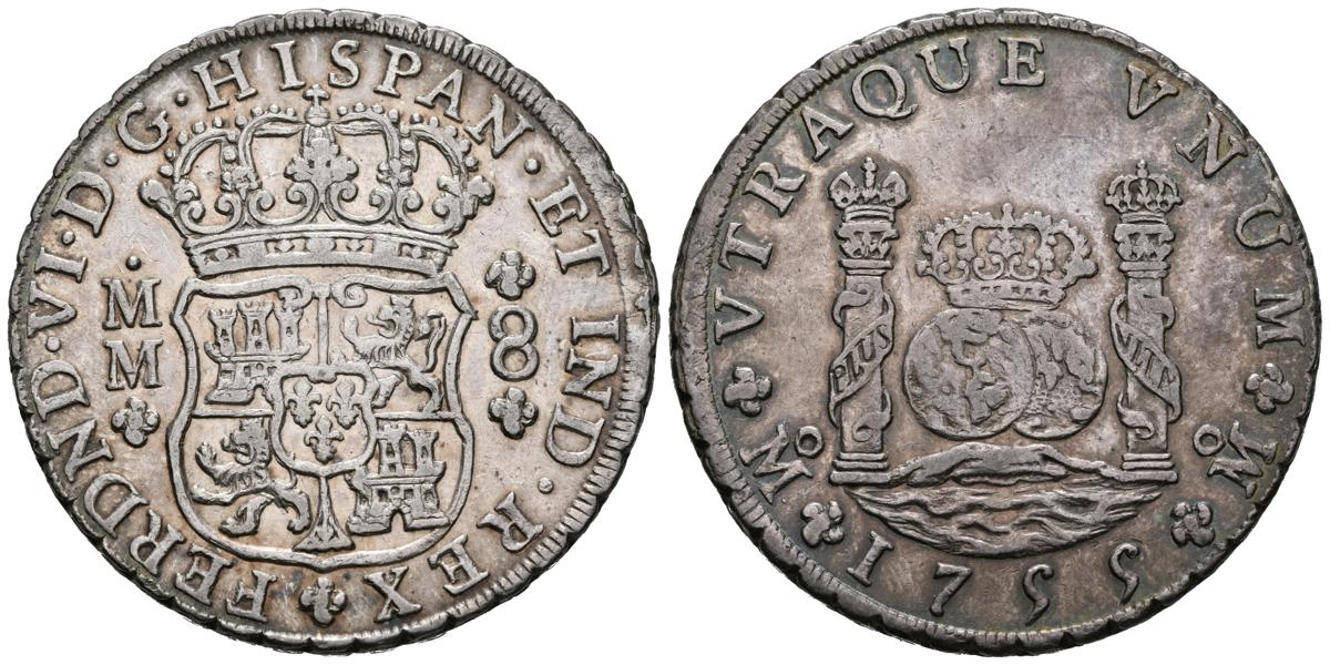 FERNANDO VI (1746-1759). 8 Reales. (Ar. 26.84g / 39mm). 1755. Mexico. MM. (Cal-2019-489). Royal and imperial crown on columns. Good Very Fine. Nice patina.