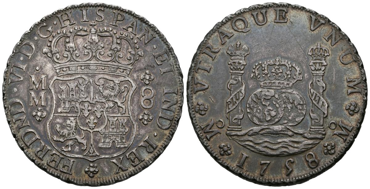 FERNANDO VI (1746-1759). 8 Reales. (Ar. 27.01g / 39mm). 1758. Mexico. MM. (Cal-2019-494). Royal and imperial crown on columns. Almost Extremely Fine. Nice iridescent patina.