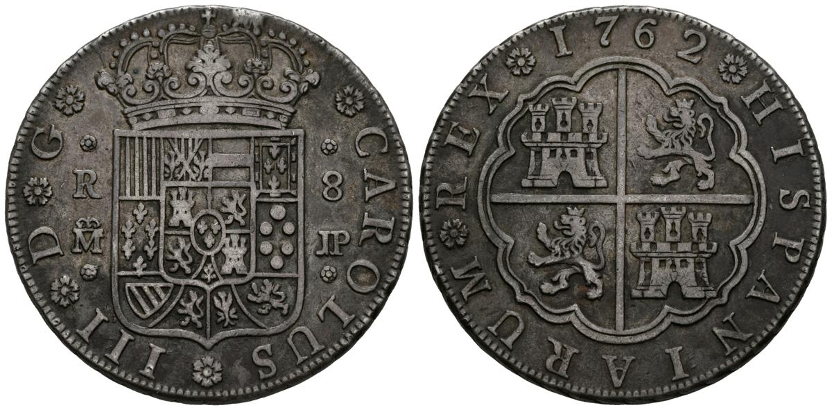 CARLOS III (1759-1788). 8 Reales. (Ar. 26.86g / 39mm). 1762 Madrid. JP. (Cal-2019-1061). Only year of minting. Very Fine. Rare