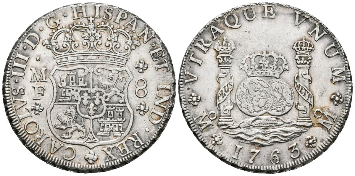 English CARLOS III (1759-1788). 8 Reales. (Ar. 27.10g / 38mm). 1763 Mexico. MF. (Cal-2019-1086). Extremely Fine. Beautiful specimen.