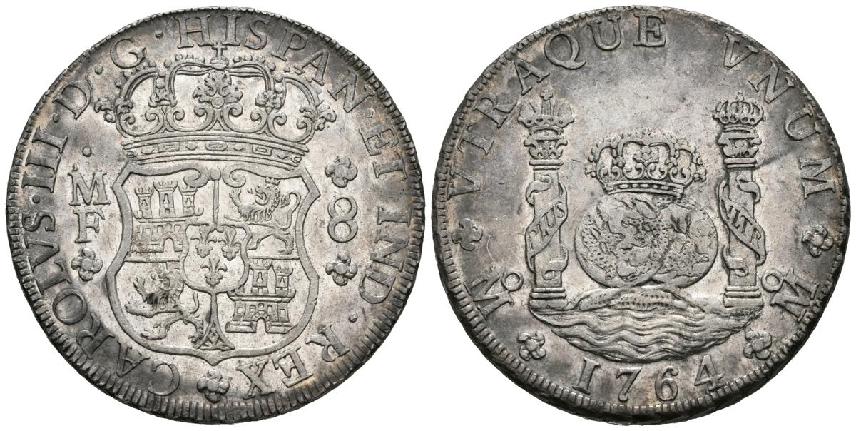 CARLOS III (1759-1788). 8 Reales. (Ar. 27.10g / 38mm). 1764. Mexico. MF. (Cal-2019-1087). Almost Uncirculated. Original Luster . Spectacular specimen, rare in this precious quality. Insignificant scratch. The quintessential Hispanic coin was minted only between 1732 and 1772. Therefore, only three kings had the privilege of ordering said minting: Felipe V, Fernando VI and Carlos III. All the columnarios, in their different modules from 1/2 to 8 reales, are minted in the American colonies, with Mexico being the most prolific mint, followed by Lima, Santa Fe de Nuevo Reino and Santiago de Chile, the rarest and scarcest. The design of all of them is common; thus on the obverse there is a large shield of Spain with a laurel crown on top and the name of the king in Latin followed by the legend “DG HISPANET IND REX”. On the reverse we find, perhaps, the most emblematic drawing of this coin: the two globes that represent east and west with a royal crown on top of both, underneath sea waves and crowned columns on both sides. The Latin legend "VTRAQUE VNVM", both are one, is intended to highlight the unity of the Spanish territories on each side of the hemisphere. The award-winning song is another of its great hallmarks. It was, from its first mints, a coin with a universal vocation, as it was perfectly valid in an economic transaction in any corner of the planet.