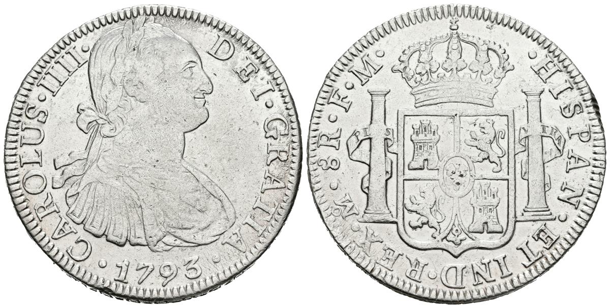 English CARLOS IV (1788-1808). 8 Reales. (Ar. 26.84 / 39mm). 1793. Mexico. FM. (Cal-2019-955). Good Very Fine. Cleansed