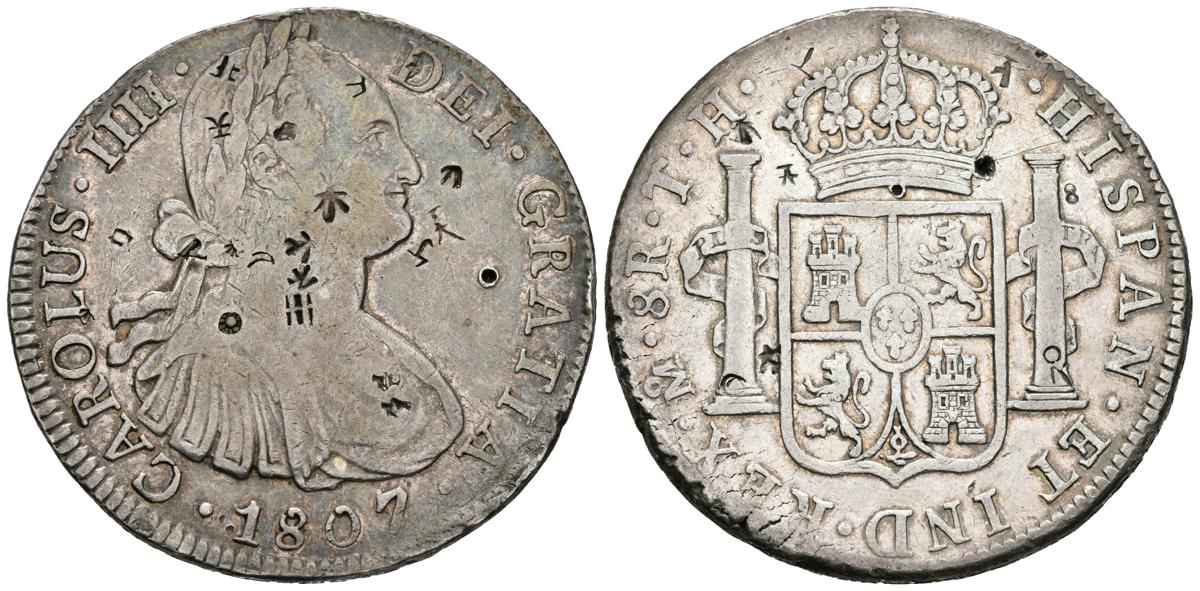 CARLOS IV (1788-1808). 8 Reales. (Ar. 26.75g / 40mm). 1807. Mexico TH. (Cal-2019-986). Very Fine. Chinese reseals. Iridescent tone.