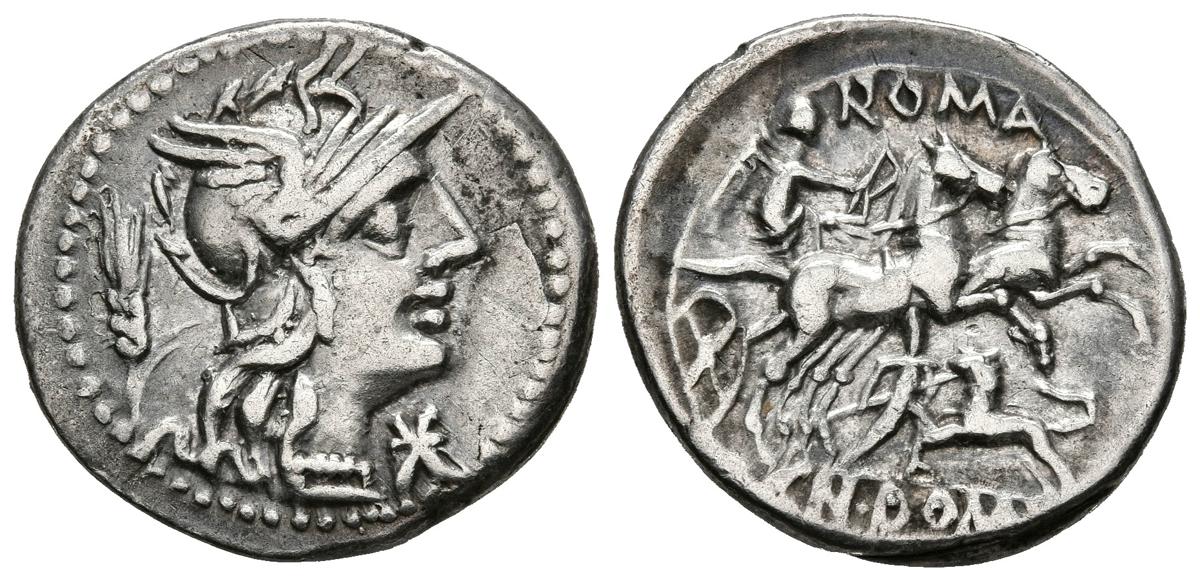 GENS DOMITIA. Denarius. (Ar. 3.83g / 20mm). 128 BC Rome. (FFC 680; Crawford 261/1). Anv: Head of Rome to the right, in front of the star, behind the spike. Rev: Victory with laurel wreath in biga on the right, below warrior fighting with lion, above legend: ROMA, in exergue: CN DOM. Very Fine.