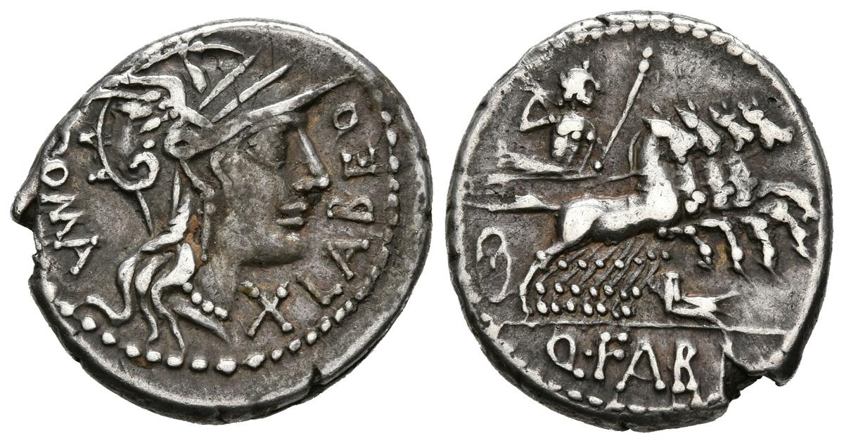 English GENS FABIA. Denarius. (Ar. 3.44g / 19mm). 124 BC Northern Italy. (FFC 697; Crawford 273/1). Ob: Head of Rome to the right, below X, in front legend: LABEO, behind legend: ROMA. Rev: Jupiter in quadriga to the right with scepter and beam of rays, below the prow of the ship, in exergue: Q FABI. Almost Very Fine.