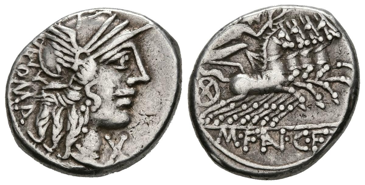 GENS FANNIA. Denarius. (Ar. 3.94g / 18mm). 123 BC Rome. (FFC 705; Crawford 275/1). Anv: Head of Rome to the right, in front of X, in back legend: ROMA. Rev: Victory with crown in quadriga on the right, in exergue: M FAN CF. Very Fine.