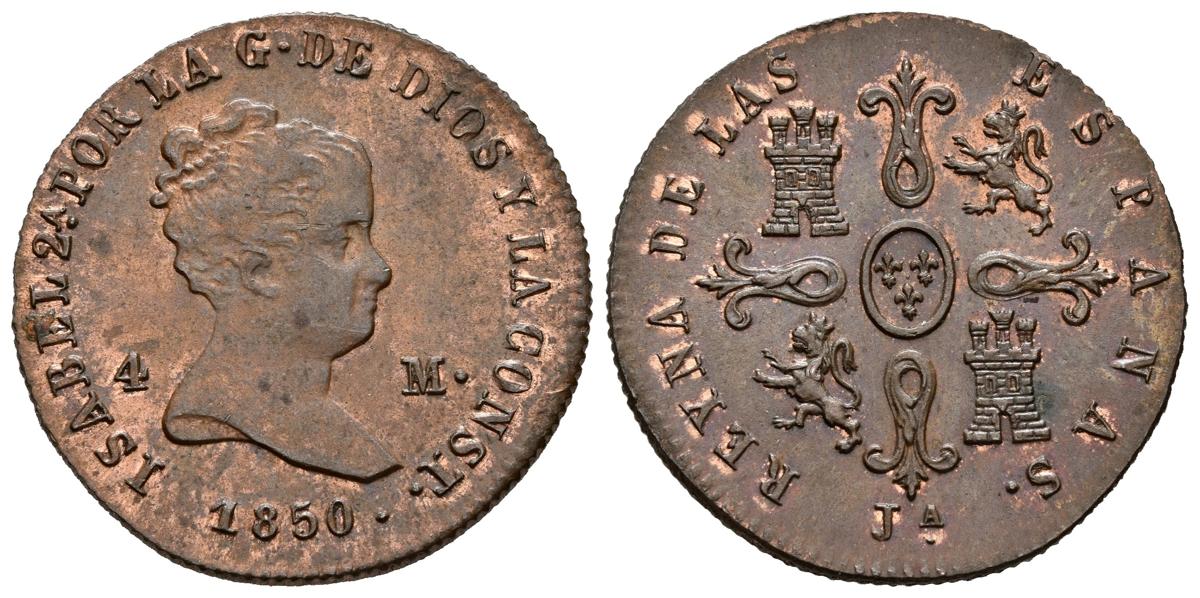 ISABEL II (1833-1868). 4 Maravedís. (Ae. 4.18g / 24mm). 1850. Jubia. (Cal-2019-76). Almost Uncirculated. Fine flan. Nice patina. Remnants of original shine. Beautiful specimen.