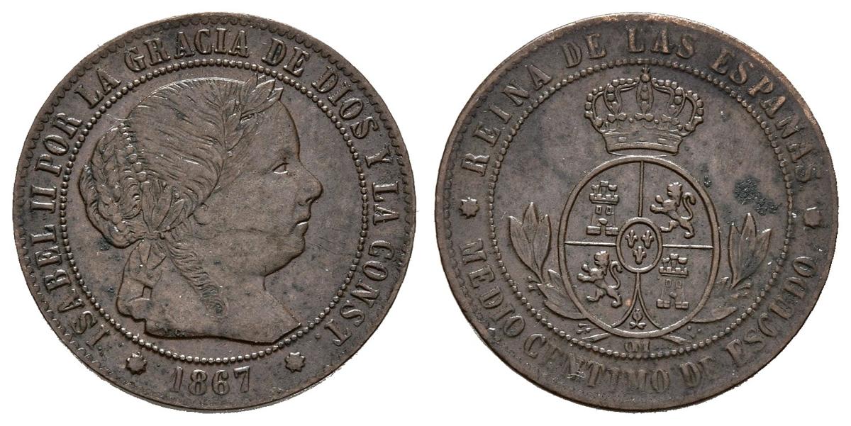 ISABEL II (1833-1868). 1/2 Céntimo de Escudo. (Ae. 1.27g / 16mm). 1867. Barcelona OM. (Cal-2019-200). Extremely Fine.