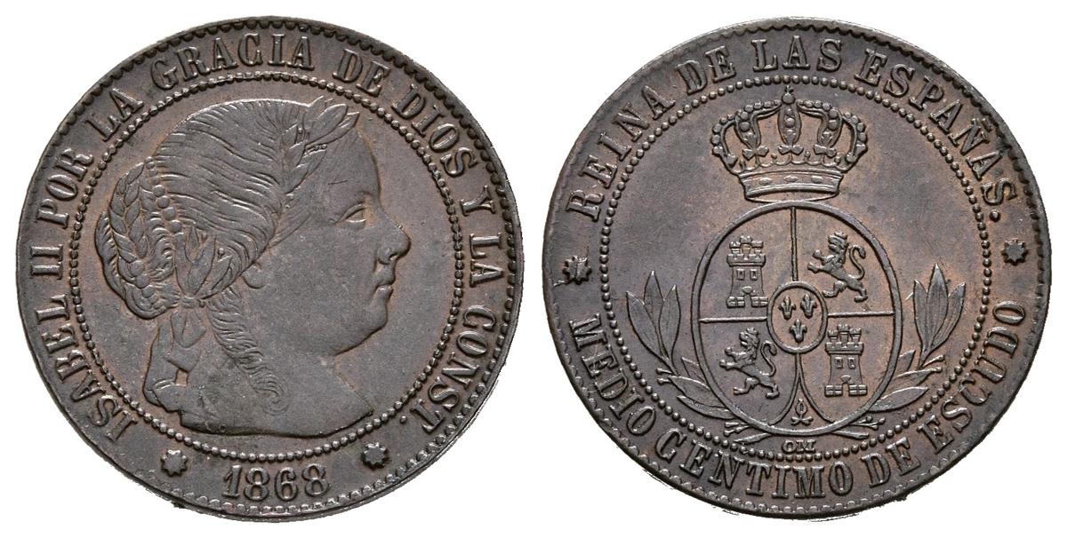 ISABEL II (1833-1868). 1/2 Céntimo de Escudo. (Ae. 1.22g / 16mm). 1868. Barcelona OM. (Cal-2019-201). Almost Uncirculated.