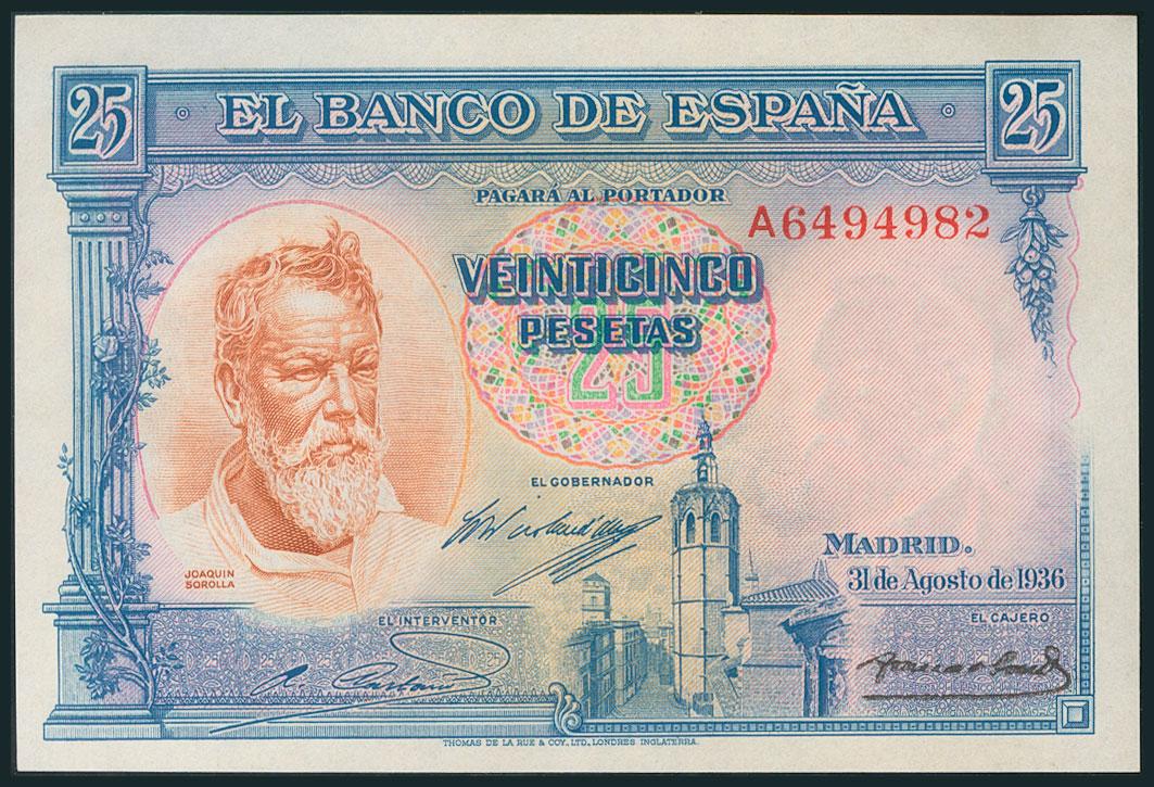 25 Pesetas. August 31, 1936. Series A. (Edifil 2017: 367a). Iron and original sizing. Uncirculated.
