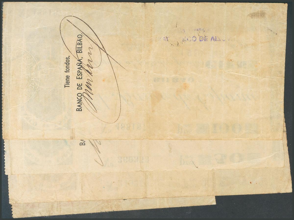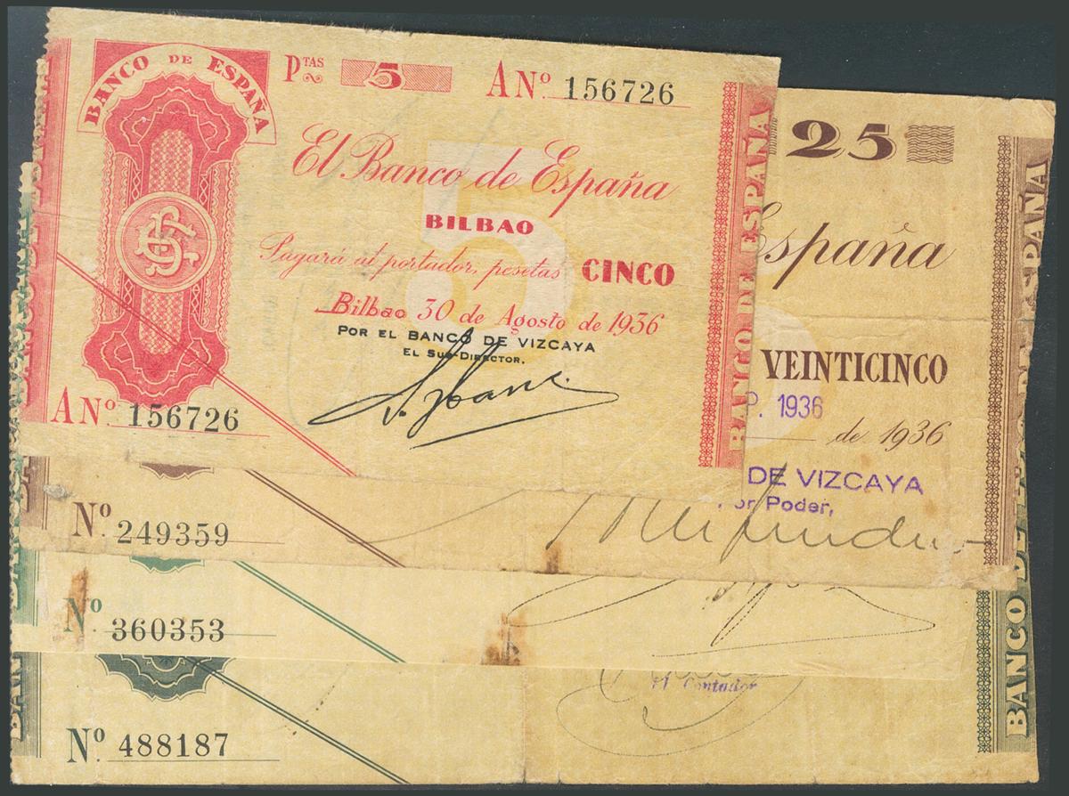 Complete set of 4 banknotes of 5 Pesetas, 25 Pesetas, 50 Pesetas and 100 Pesetas, issued as of August 30, 1936 by the Bank of Spain in its branch in Bibao, all of them with series A and the pre-signature of the Bank of Biscay. (Edifil 2017: 368a, 369a, 370a, 371a). Almost Very Fine/ Good Fine.