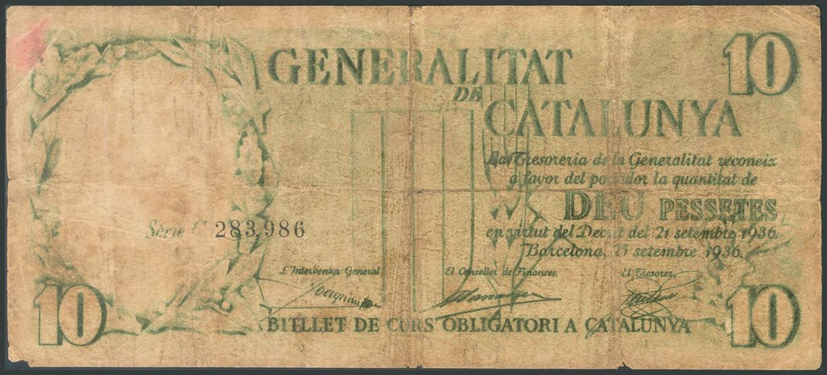 English 10 Pesetas. September 26, 1936. Generalitat de Catalunya. Series C. (Edifil 2017: 374). Good.