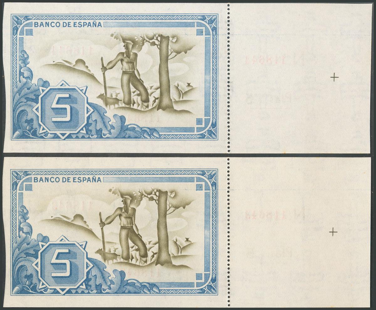 5 Pesetas. January 1, 1937. Correlative couple with series A and with matrix on the left, with the forerunner of Banco Urquijo Vascongado. (Edifil 2017: 386f). Original sizing. Almost Uncirculated.