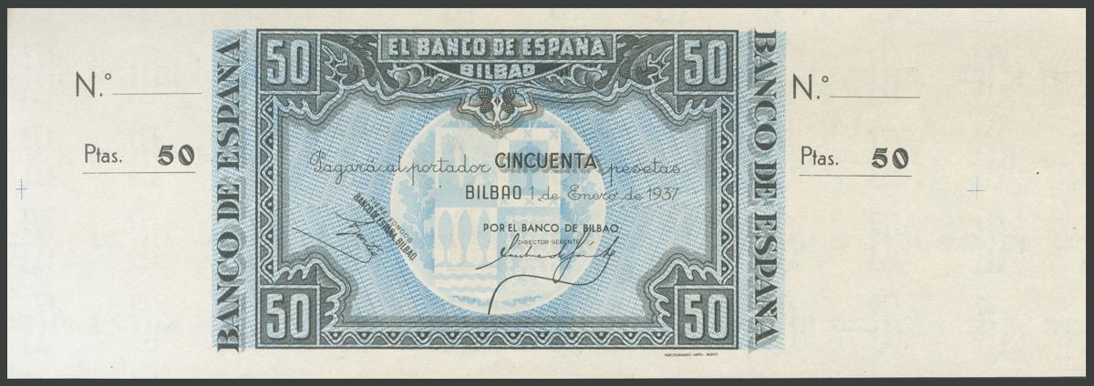 English 50 Pesetas. January 1, 1937. Bilbao branch, signed by Banco de Bilbao. Without series and without numbering, with both matrices. (Edifil 2017: 389a). Almost Uncirculated.