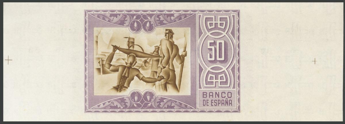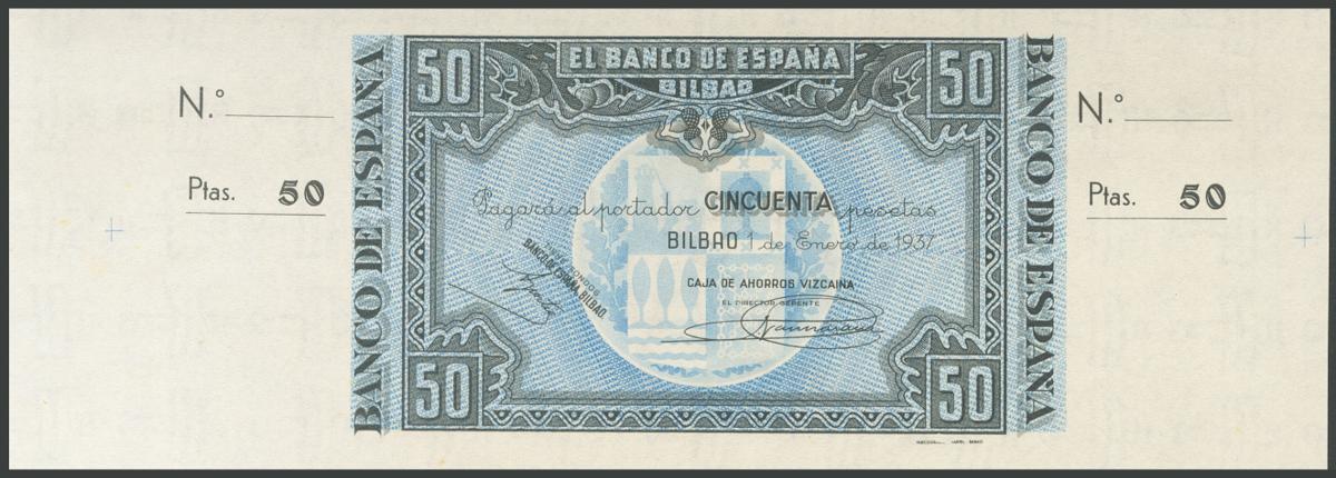 50 Pesetas. January 1, 1937. Bilbao branch, previously signed by Caja de Ahorros Vizcaína. Without series and with both matrices. (Edifil 2017: 389f). Good Extremely Fine.