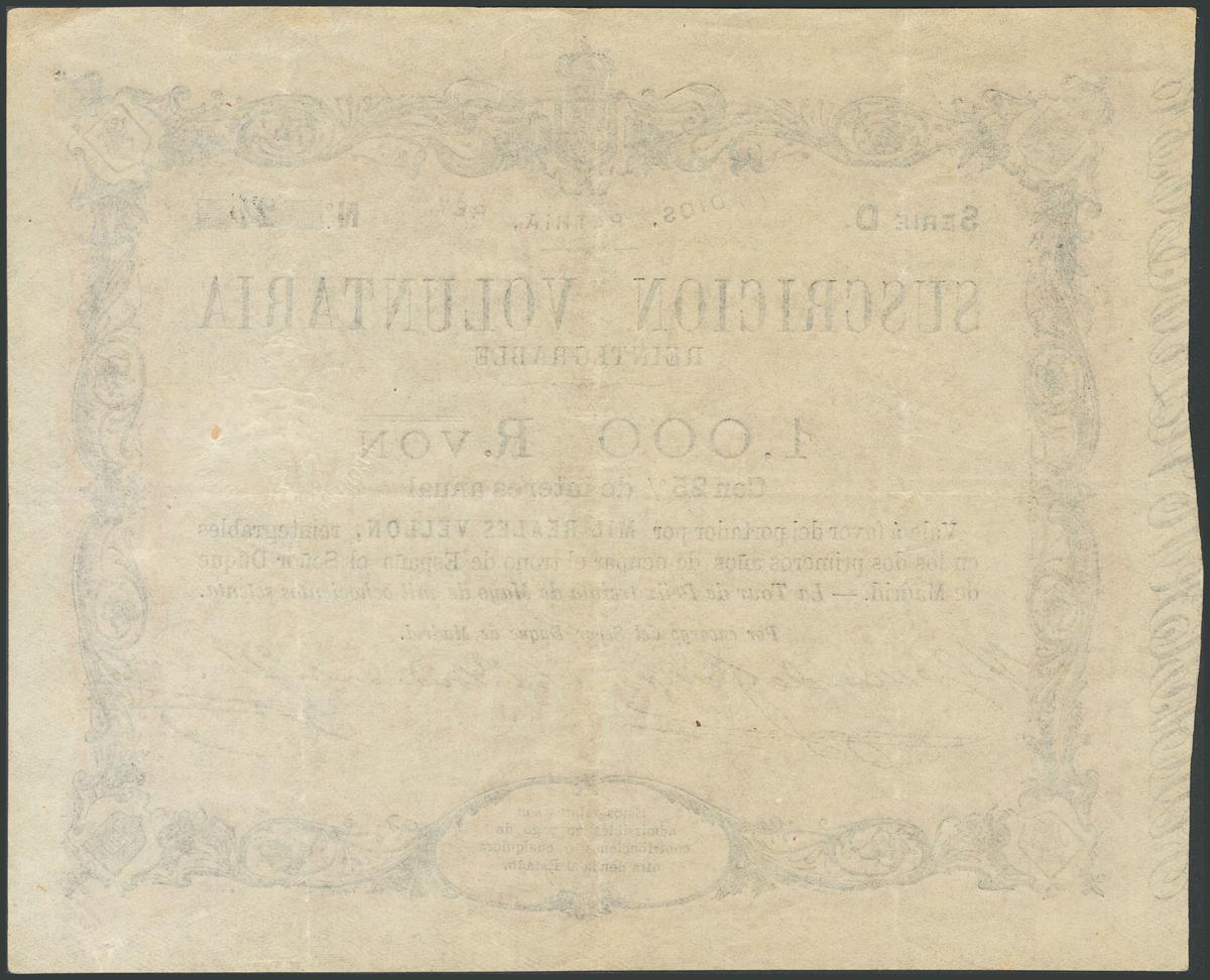 1000 Reales de Vellón. May 30, 1876. Tour de Peilz broadcast. Series D. (Edifil 2017: 199). Good Very Fine.