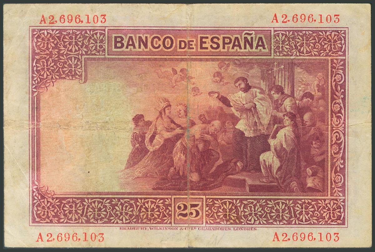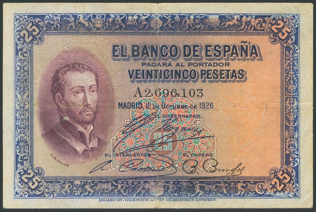 English 25 Pesetas. October 12, 1926. Series A. Dry stamp SPANISH STATE / BURGOS. (Edifil 2017: 402). Fine.