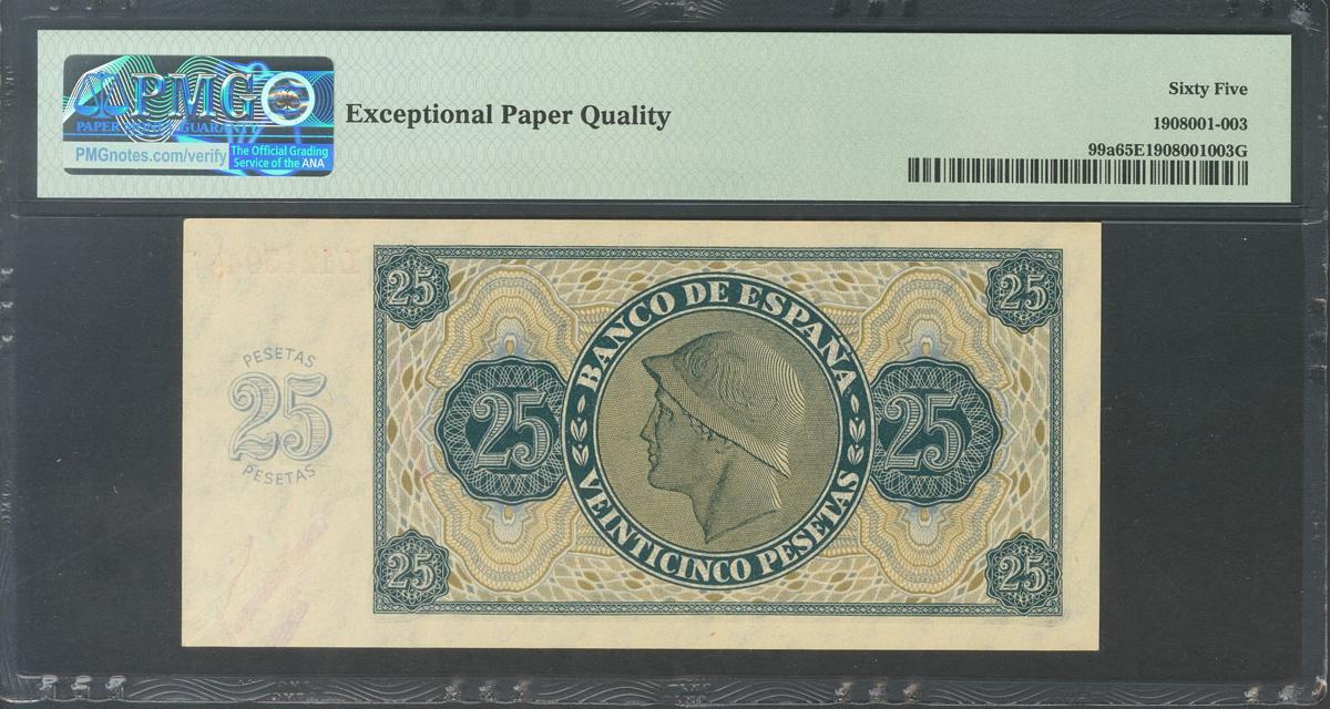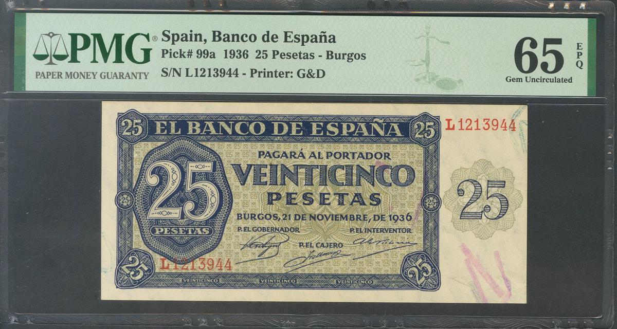 25 Pesetas. November 21, 1936. Series L. (Edifil 2017: 419a). Original sizing. Uncirculated. Packaged PMG65EPQ.
