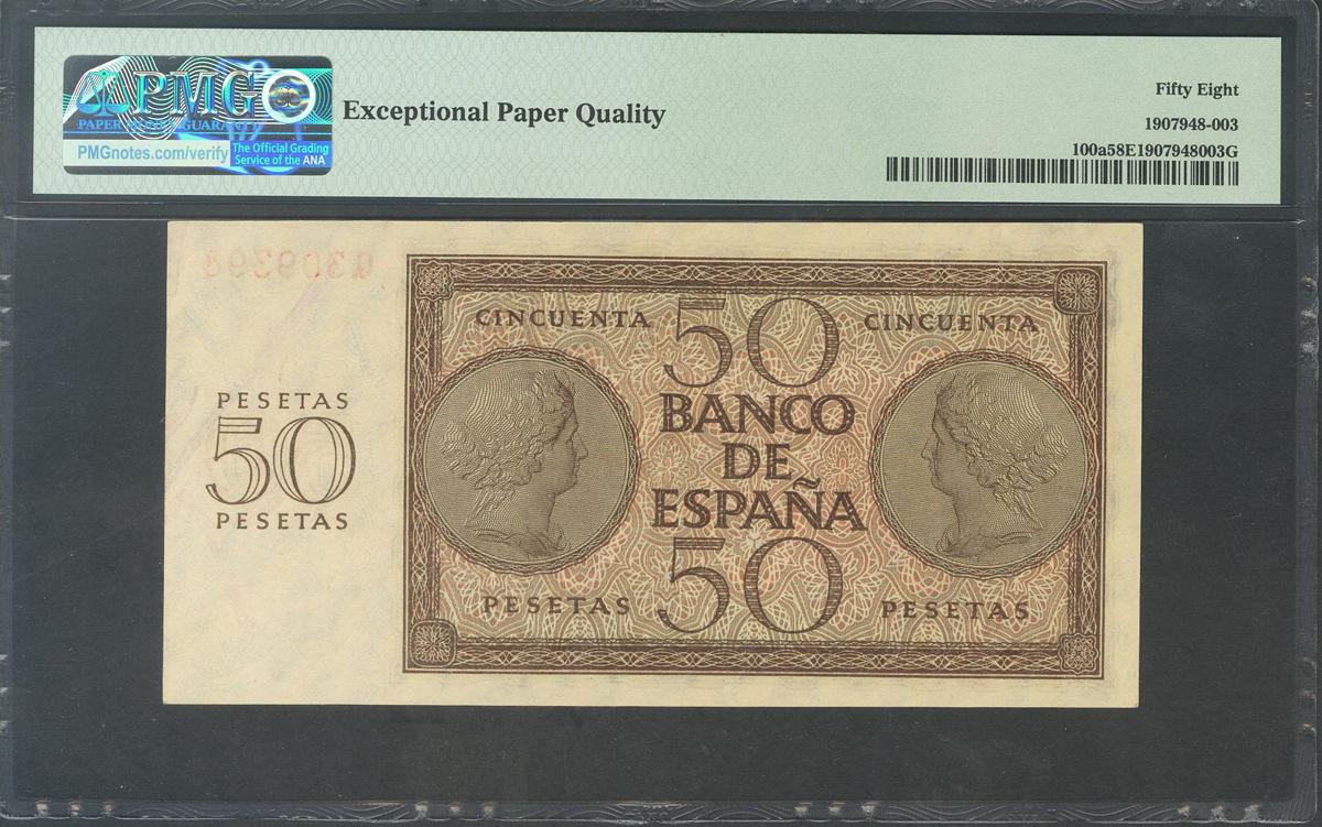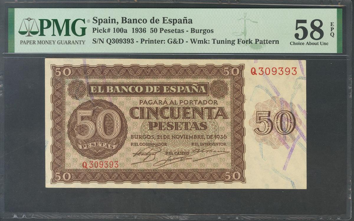 50 Pesetas. November 21, 1936. Series Q. (Edifil 2017: 420a). It keeps all its original sizing. Good Extremely Fine. Package PMG58EPQ.
